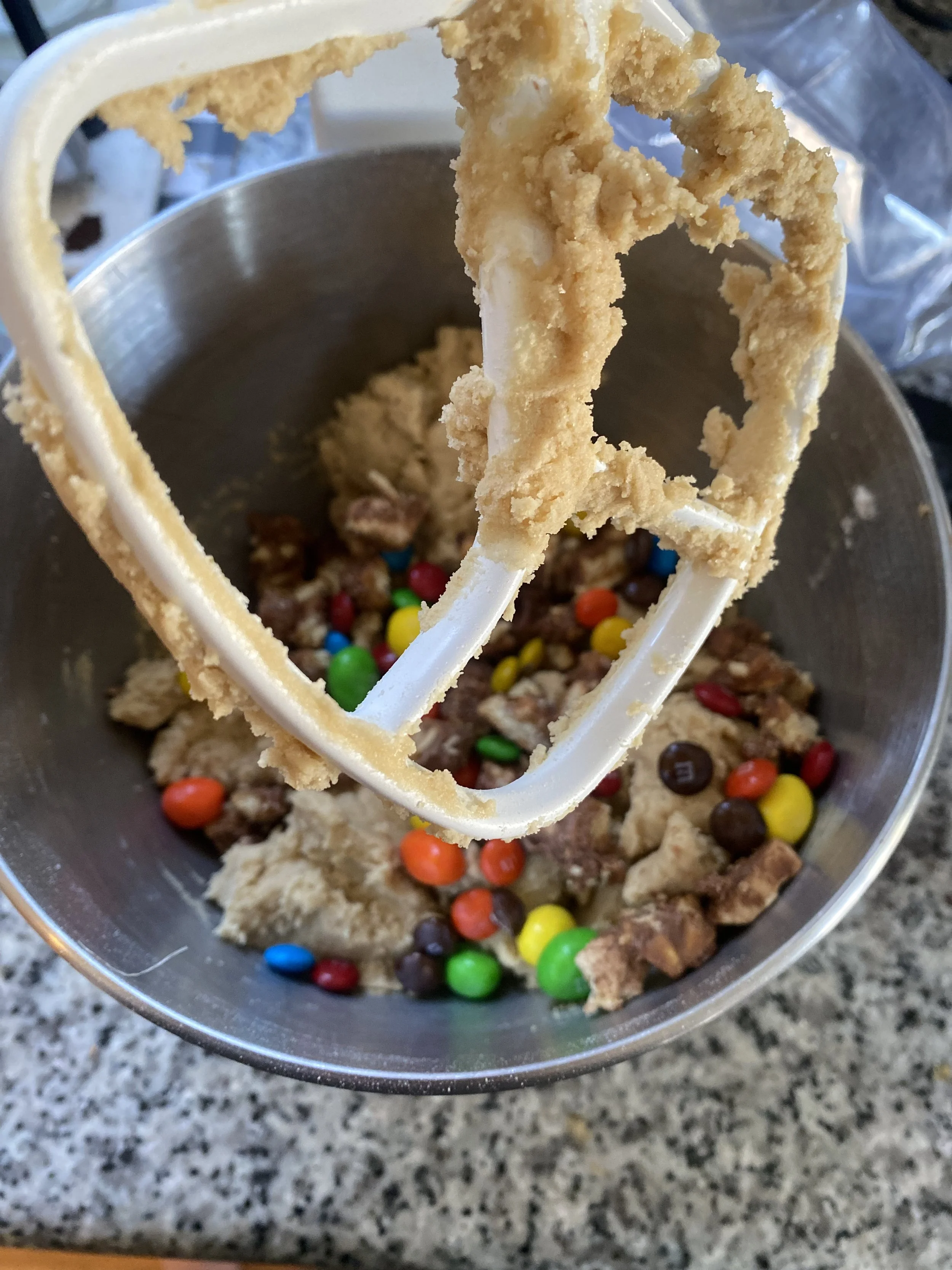 Chop any leftover halloween candy you have and place it into the bowl with the dough. Fold in with a rubber spatula.